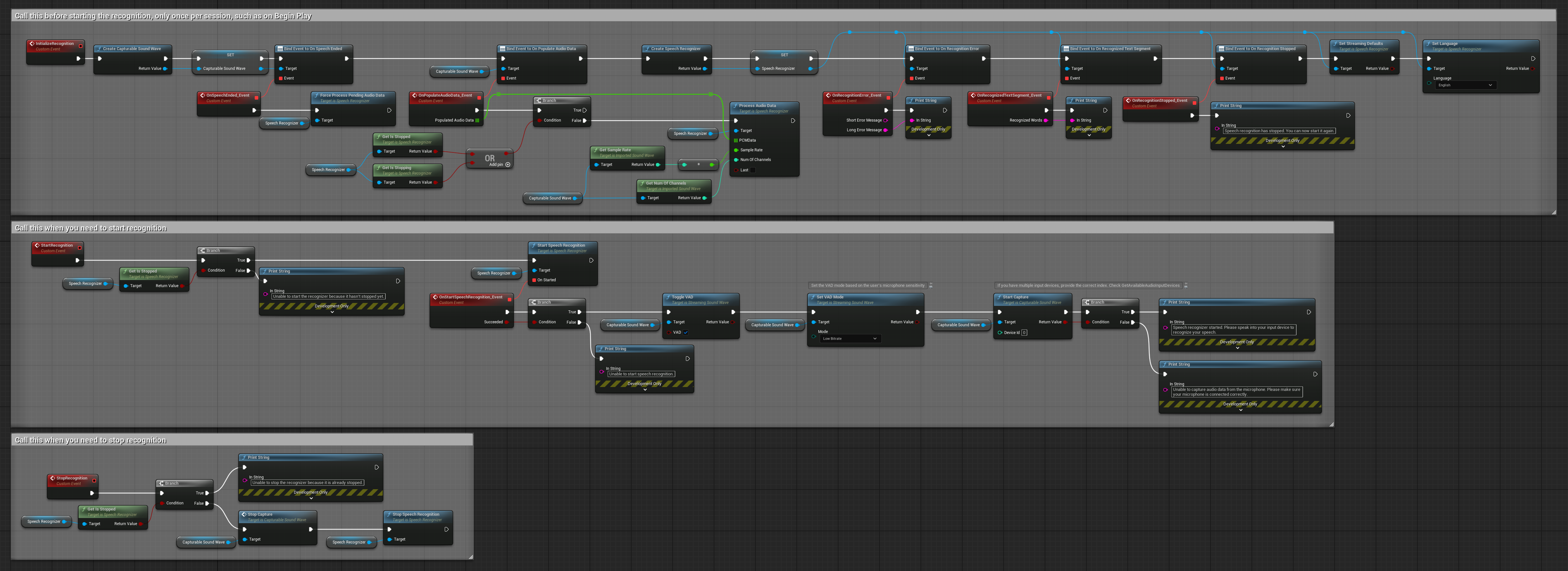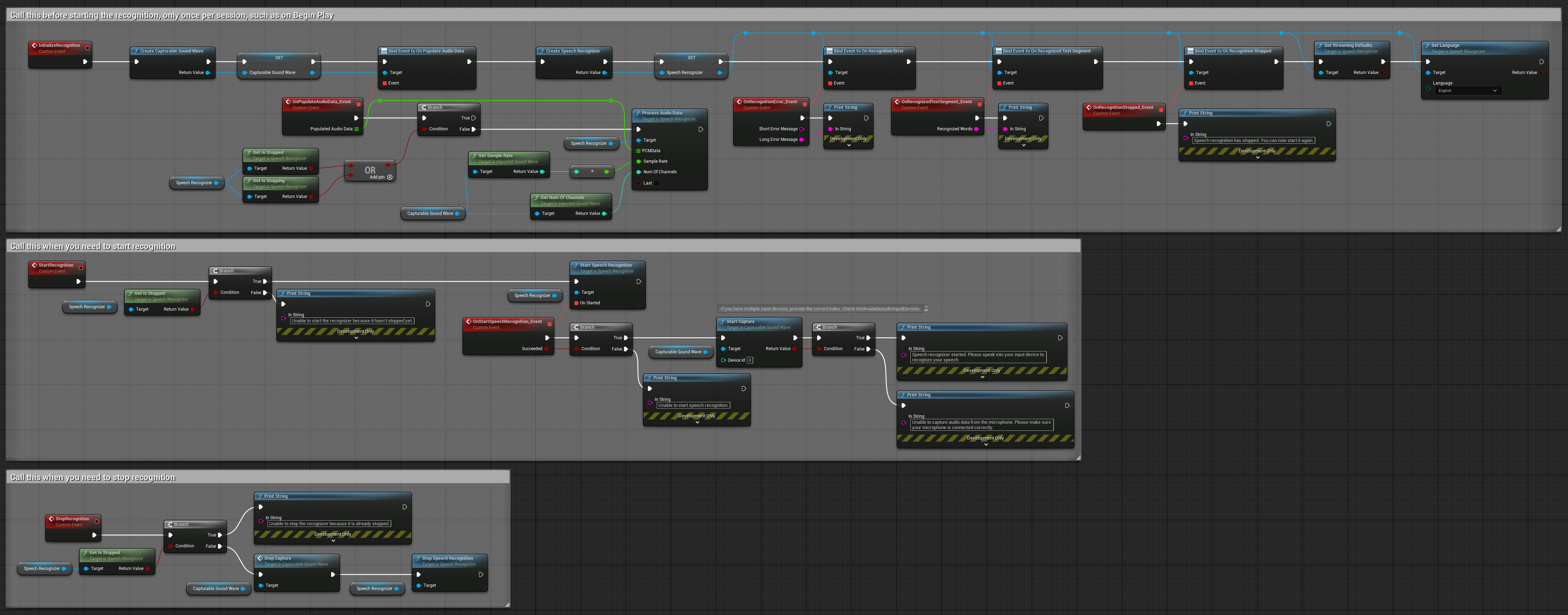 이 예제들은 Runtime Audio Importer를 사용하여 오디오 데이터를 얻는 것을 예로 들어, 스트리밍 및 비스트리밍 오디오 입력과 함께 Runtime Speech Recognizer 플러그인을 사용하는 방법을 보여줍니다. 예제에서 보여주는 동일한 오디오 임포트 기능 세트(예: 캡처 가능한 사운드 웨이브 및 ImportAudioFromFile)에 액세스하려면 RuntimeAudioImporter를 별도로 다운로드해야 합니다. 이러한 예제들은 핵심 개념을 설명하기 위한 목적으로만 제공되며 오류 처리를 포함하지 않습니다.